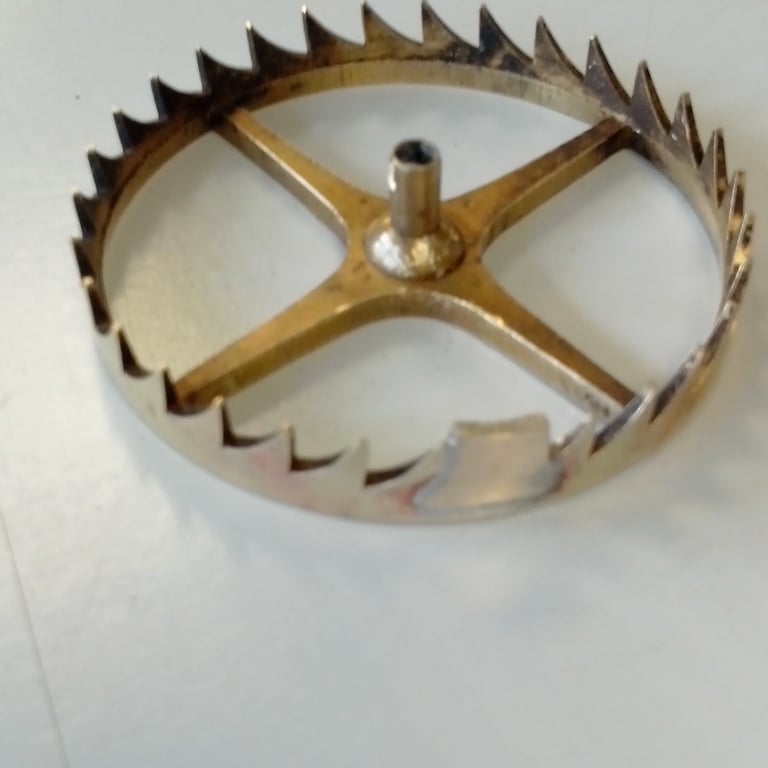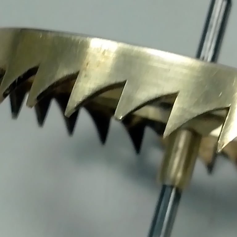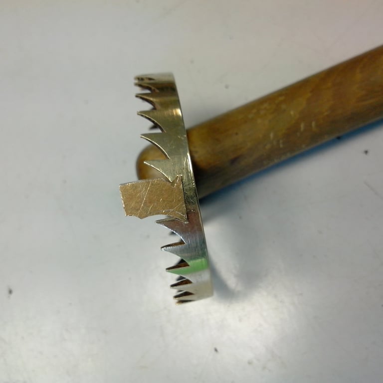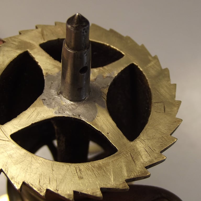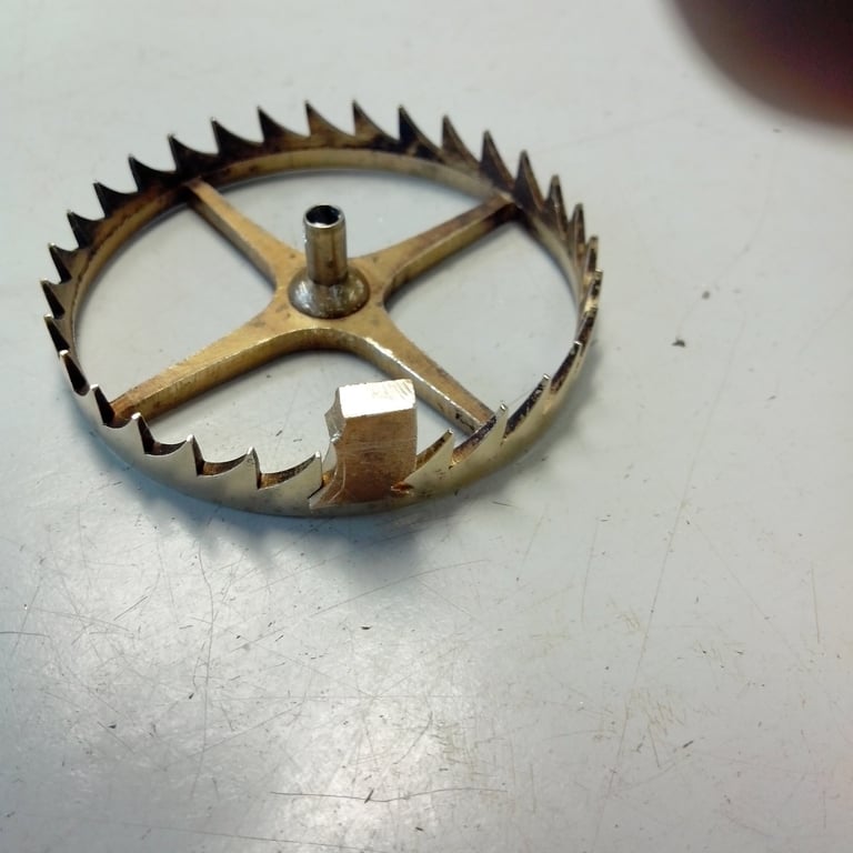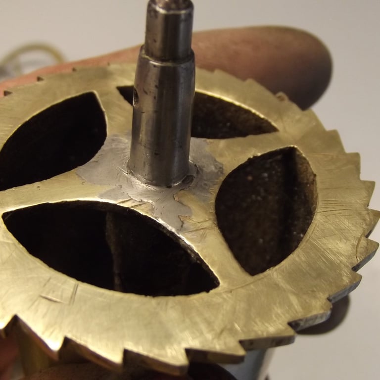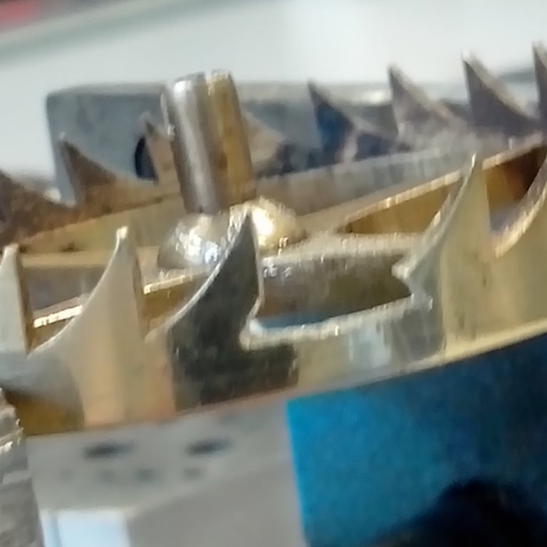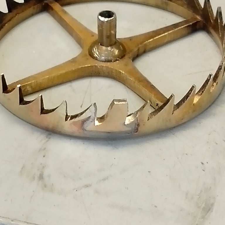Une dent de la roue de rencontre est écrasée et perturbe l'échappement. Il faut donc concevoir une nouvelle dent à partir dun morceau de laiton. On appelle cela réaliser une queue d'aronde.