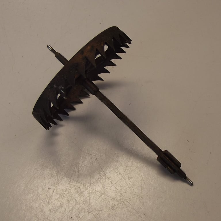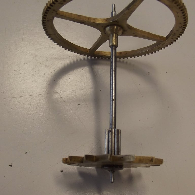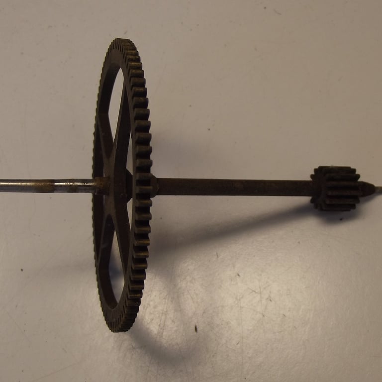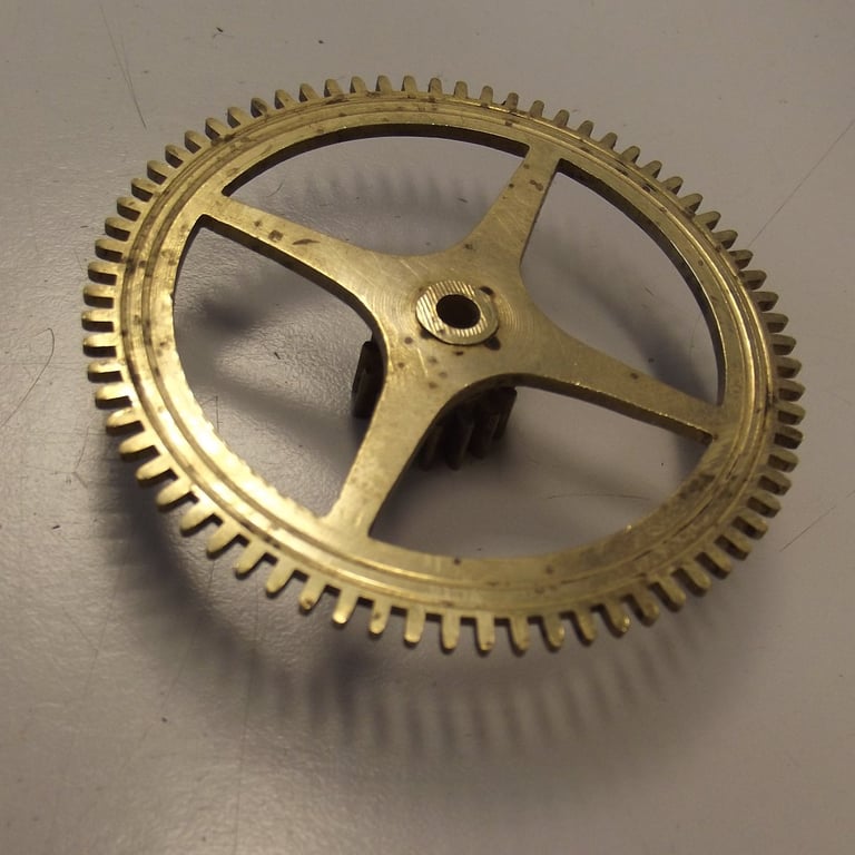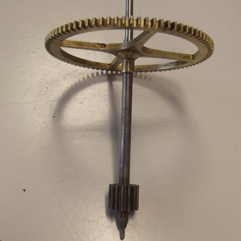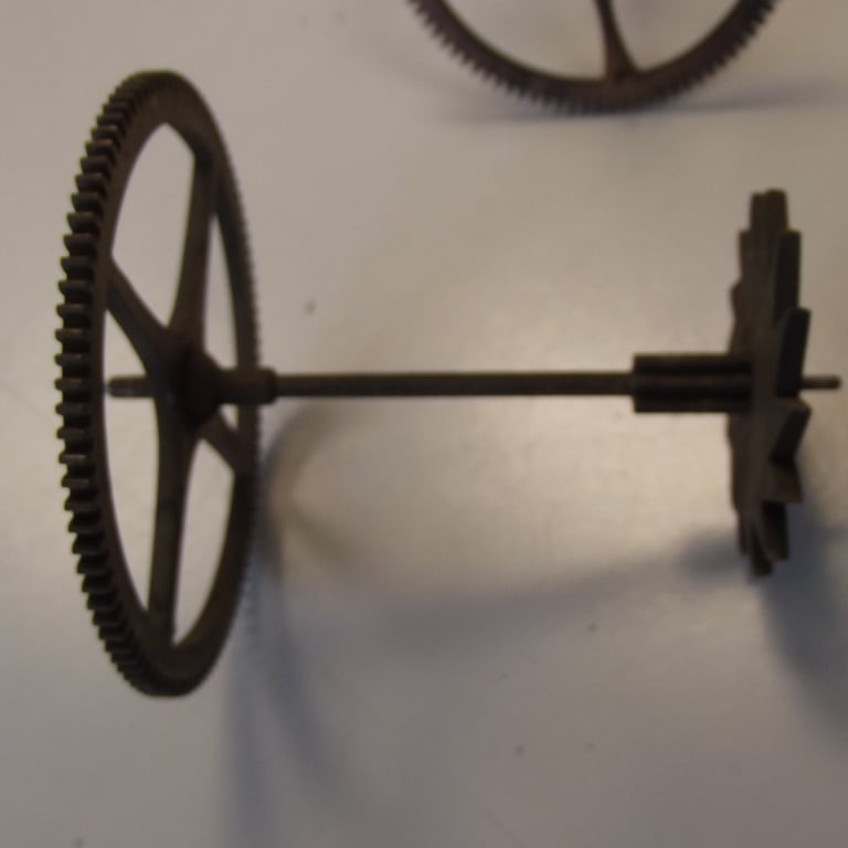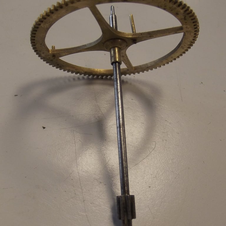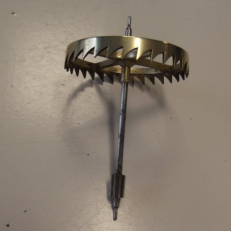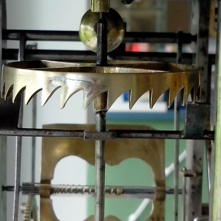 Une dent de la roue de rencontre est écrasée et perturbe l'échappement. Il faut donc concevoir une nouvelle dent à partir dun morceau de laiton. On appelle cela réaliser une queue d'aronde.