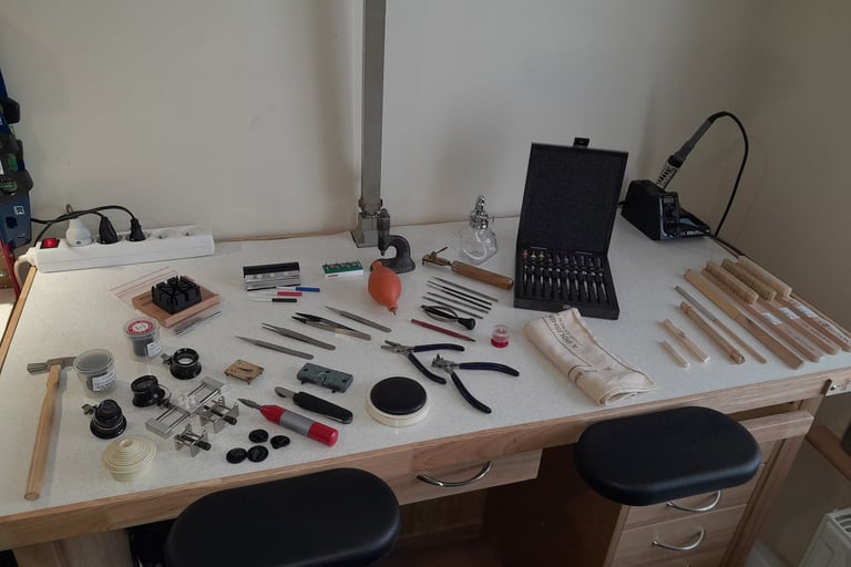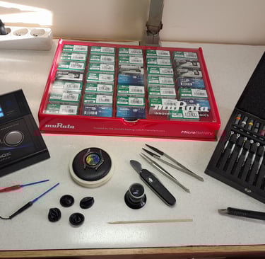 Voici une présentation de quelques outils que j'utilise très régulièrement. Il y en a beaucoup et ne sont pas tous sur la photo. Tous les outils utilisés viennent de fournisseurs spécialisés dans l'équipement et la fourniture de pièces pour l'horlogerie. C'est un gage de qualité.