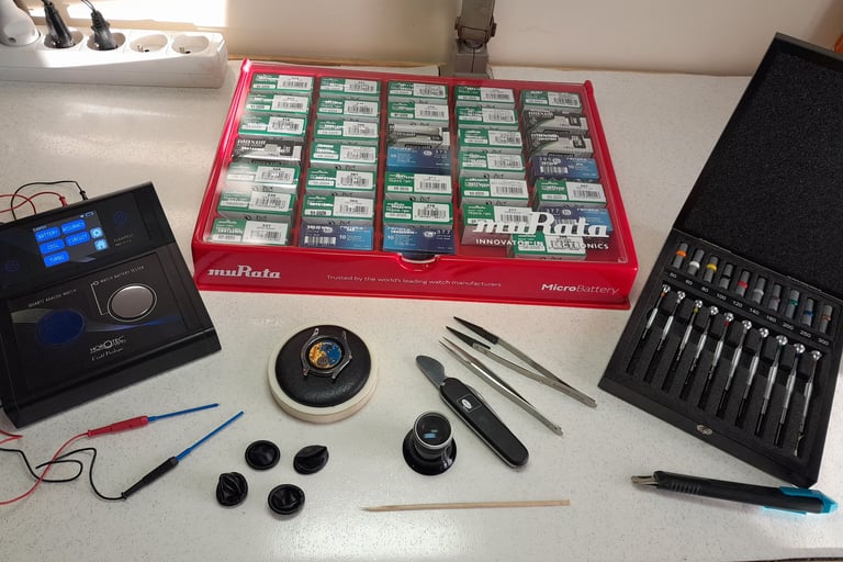 Le travail s'effectue avec de nombreux outils, dont l'utilisation est spécifique pour chaque tâche à réaliser. Ceux-ci sont principalement commercialisés par des fournisseurs et des grossistes de l'horlogerie-bijouterie. Des soins particuliers s'imposent concernant leur utilisation et leur entretien, comme c'est le cas pour les tournevis. En effet, l'horloger choisit la taille de chaque tournevis en fonction du diamètre de la tête de vis et adapte l'épaisseur de la lame par rapport à l’empreinte de la tête pour ne pas l'endommager. Personnellement, pour cet ajustement, j'utilise une pierre India.